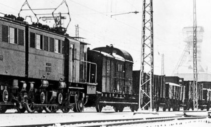 Die E 95 01 im Jahr 1928 vor einem gemischten Güterzug im Bahnhof Dittersbach. Copyright: RVM/Slg. Eisenbahnstiftung.
