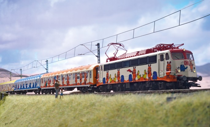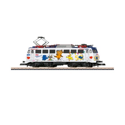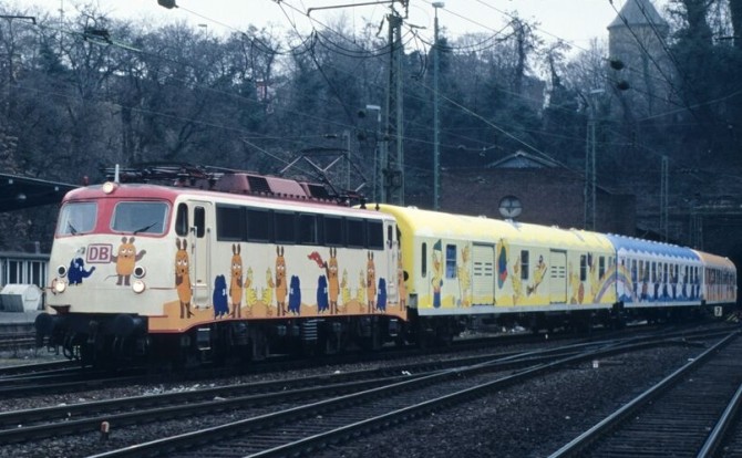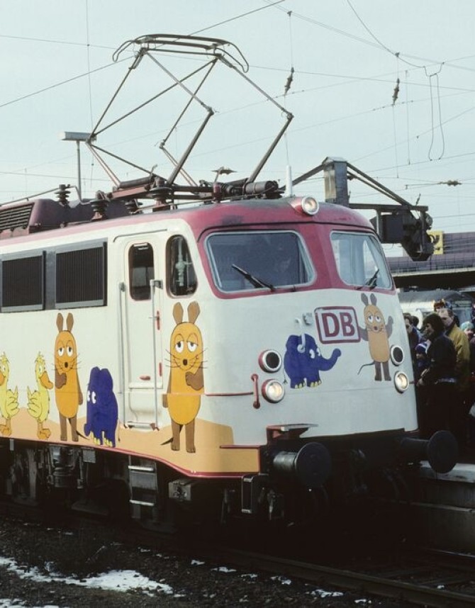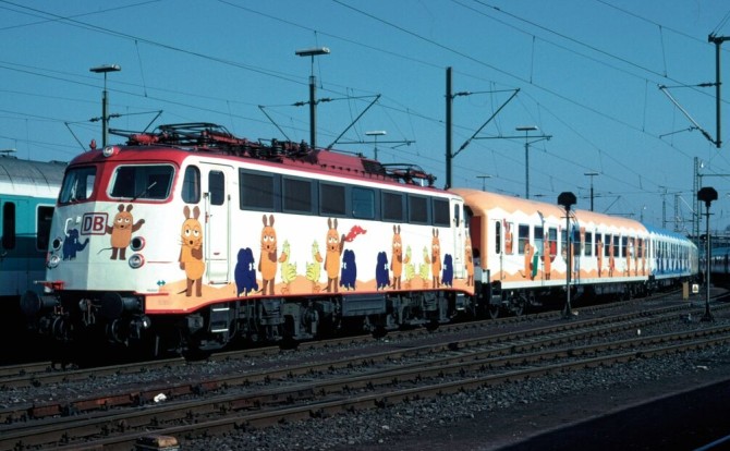 Zum 25. Jubiläum der "Sendung mit der Maus" fuhr im Frühjahr 1996 der "Mausexpress" mit 100 487 der DB AG für ca. 6 Wochen von Stadt zu Stadt. Märklin brachte bereits damals die Modelle in den Nenngrößen H0 und Z. (TRIX / MINITRIX gehörten damals noch nicht zum Unternehmen)