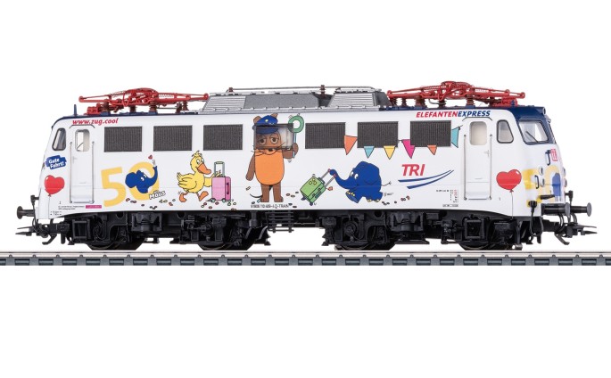 zum 50. Geburtstag des kleinen blauen Elefanten hat die TRI eine Lok der Baureihe 110.3 mit den Charakteren der Sendung mit der Maus dekoriert. Diese Lok erscheint nun von Märklin, TRIX und MINITRIX in H0, N und Z.