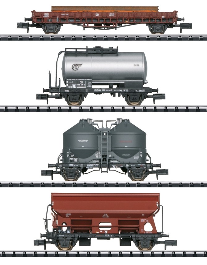 Das vierteilige Set enthält je einen Niederbordwagen Rmrso 31, einen zweiachsigen Kesselwagen, einen Silowagen Kds 56 der VTG und einen Seitenentladewagen Ktmmvs 69. Alle Wagen sind bei der Deutschen Bundesbahn eingestellt. Der Niederbordwagen ist mit Stahlstangen beladen. Der Selbst- oder Seitenentladewagen ist werkseitig mit fein bedruckten Schlussscheiben versehen.